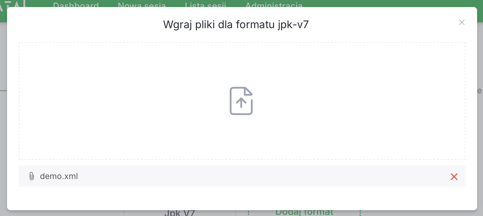 Większość formatów takich jak JPK-V7, Ksef czy Optima zawierają wszystkie wymagane dane w jednym pliku. W takim przypadku wystarczy, że wybierzesz plik z dysku lub przeciągniesz go na oznaczone pole, i dany plik zostanie załadowany do aplikacji. Każdy załadowany przez Ciebie plik zostanie zwalidowany, aby upewnić się, że jest on określonego formatu.