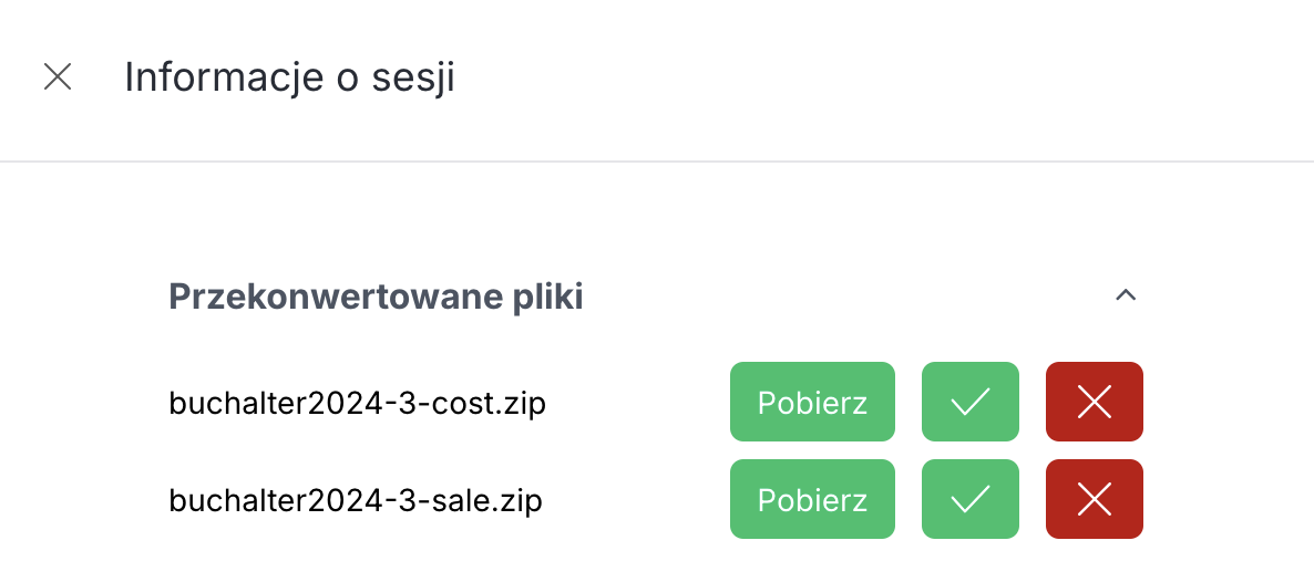 Jeśli proces konwersji przejdzie pomyślnie, zostaną zablokowane kredyty odpowiadające wartości sesji. Zostaną one ściągnięte dopiero po zaakceptowaniu konkretnych plików. Otworzy się również pasek boczny z Informacjami o sesji, gdzie będziesz mógł pobrać wygenerowane pliki.
